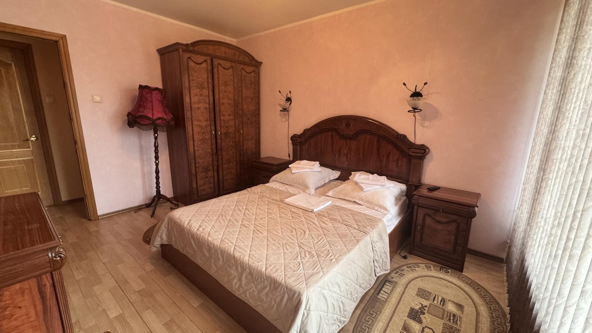 Жилая площадь (35-39 кв. м.). В номере имеется 1 двуспальная кровать(160х200), две тумбочки, шкаф-купе, телевизор. В гостиной — набор мягкой мебели, столик, графин со стаканами, чайник, холодильник. Прихожая. Санузел с душем. В номере имеется балкон.